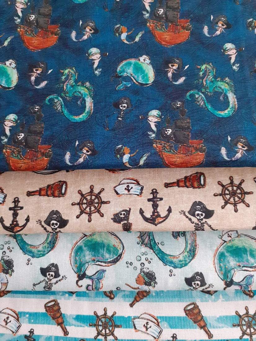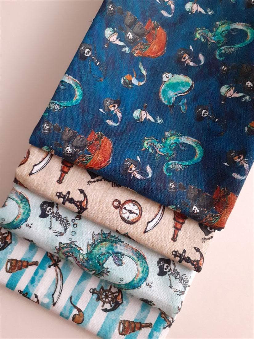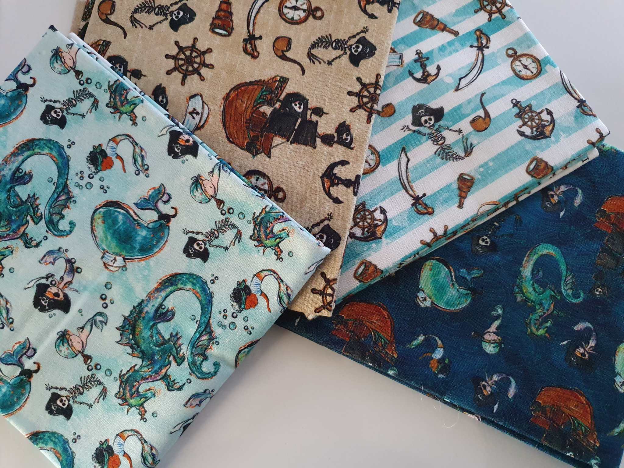 Pirate ships nautical fabric bundle with whales, dragons, and pirate-themed patterns on cotton fat quarters Pirate ships nautical fabric bundle with whales, dragons, and pirate-themed patterns on cotton fat quarters